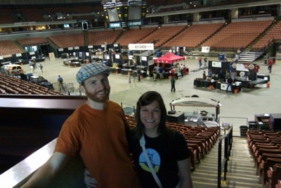 So they come up to the stage to browse the wares, and I head back to the concourse with my cooler. We notice the guy has started stuffing beer bottles into his cargo shorts. Nicole goes to take a picture of them and then comes back.