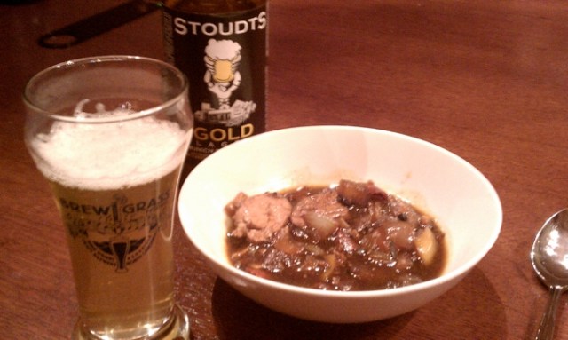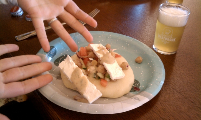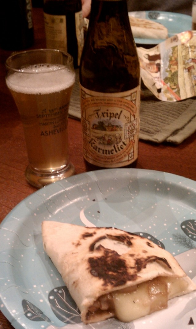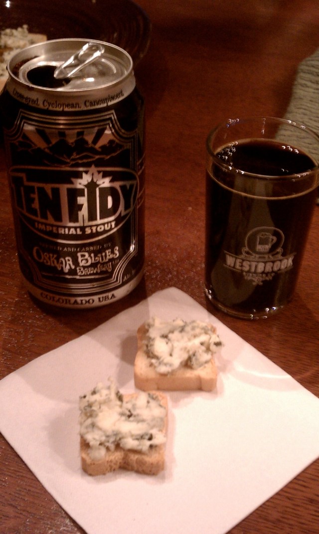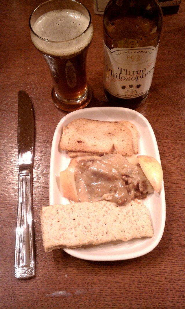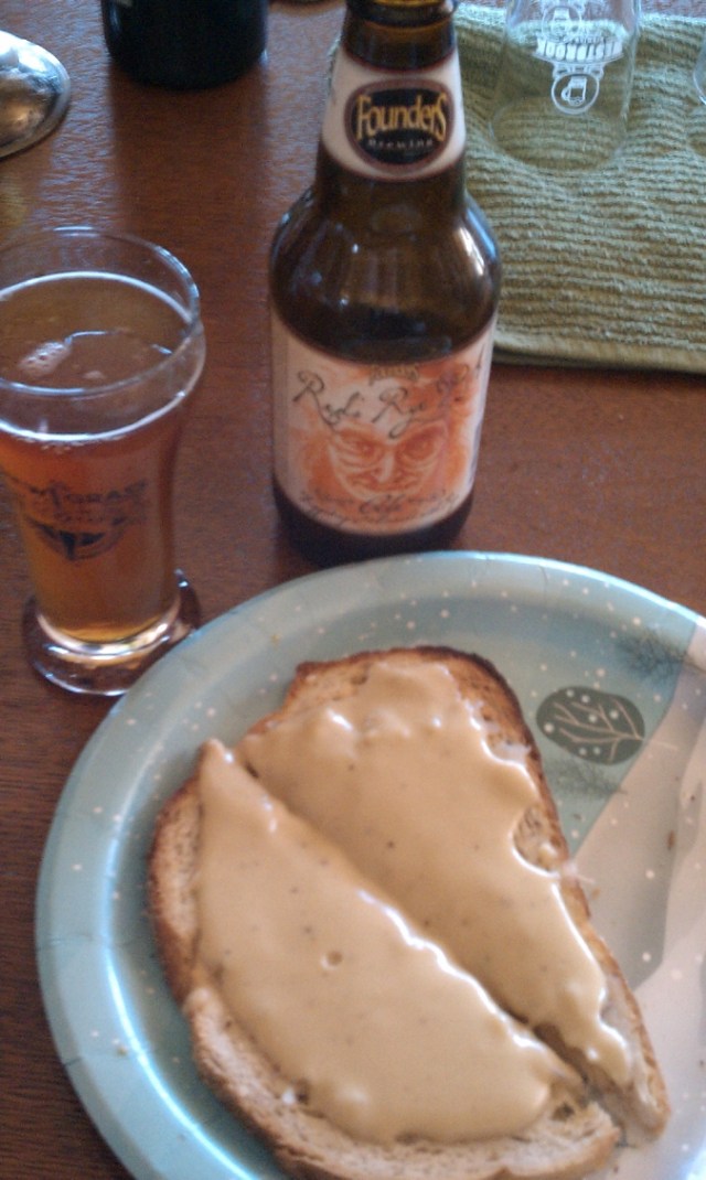 Our lunch of pretzels and sausage, accompanied by Oaked Arrogant Bastard and Cali-Belgique